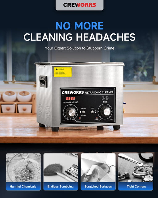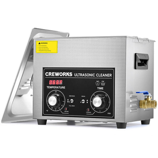 Creworks' Cleaning Equipment with industrial-grade transducers provides greater cleaning power and reliability. The 304 stainless steel casing ensures safety and easy cleaning. We offer three main product categories: Digital Ultrasonic Cleaner, which ensures thorough and gentle cleaning by precisely controlling cleaning time and temperature, effectively removing dirt without damage; Manual Knob Ultrasonic Cleaner, retaining a vintage design with tactile feedback for convenient operation, especially with gloves, featuring a durable mechanical knob that simplifies usage and reduces faults; and the Upgraded Professional Ultrasonic Cleaner, doubling heating power and speed, ideal for professional commercial use. These cleaners are effective for various items such as dentures, jewelry, and lenses, delivering outstanding results.
