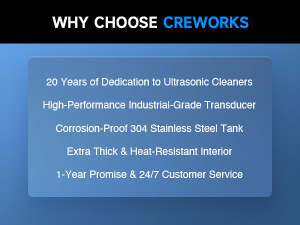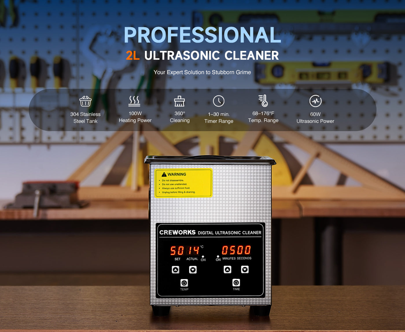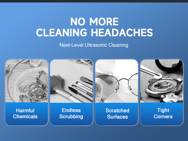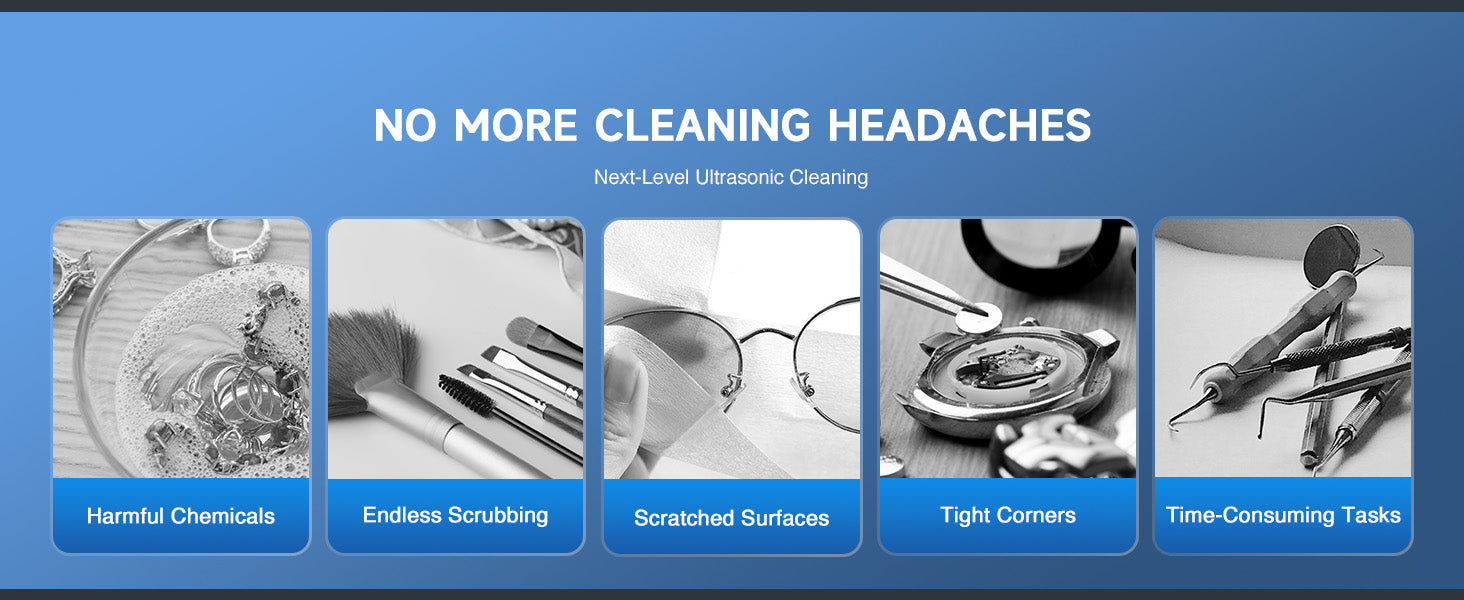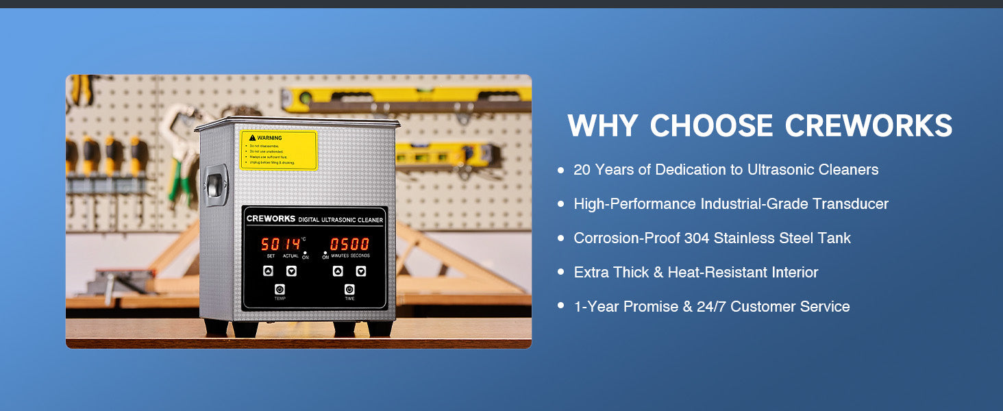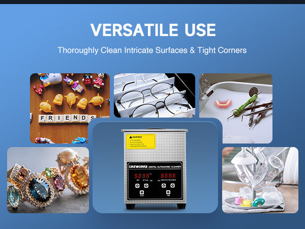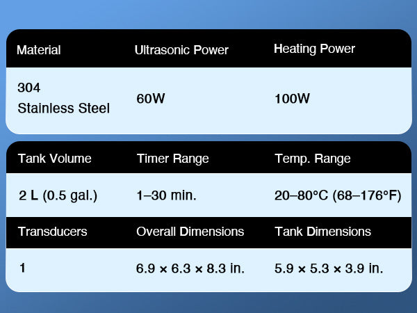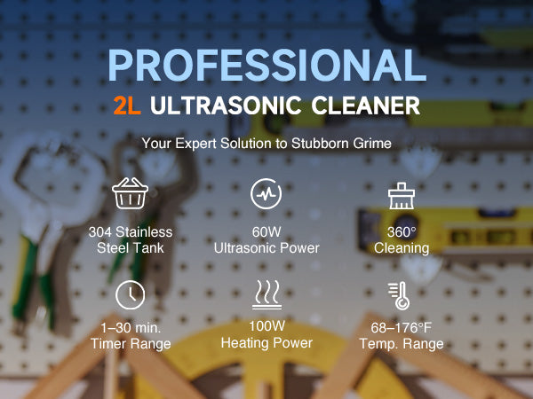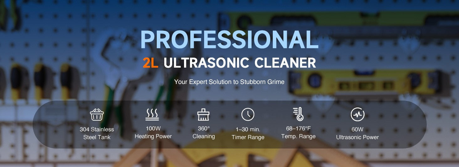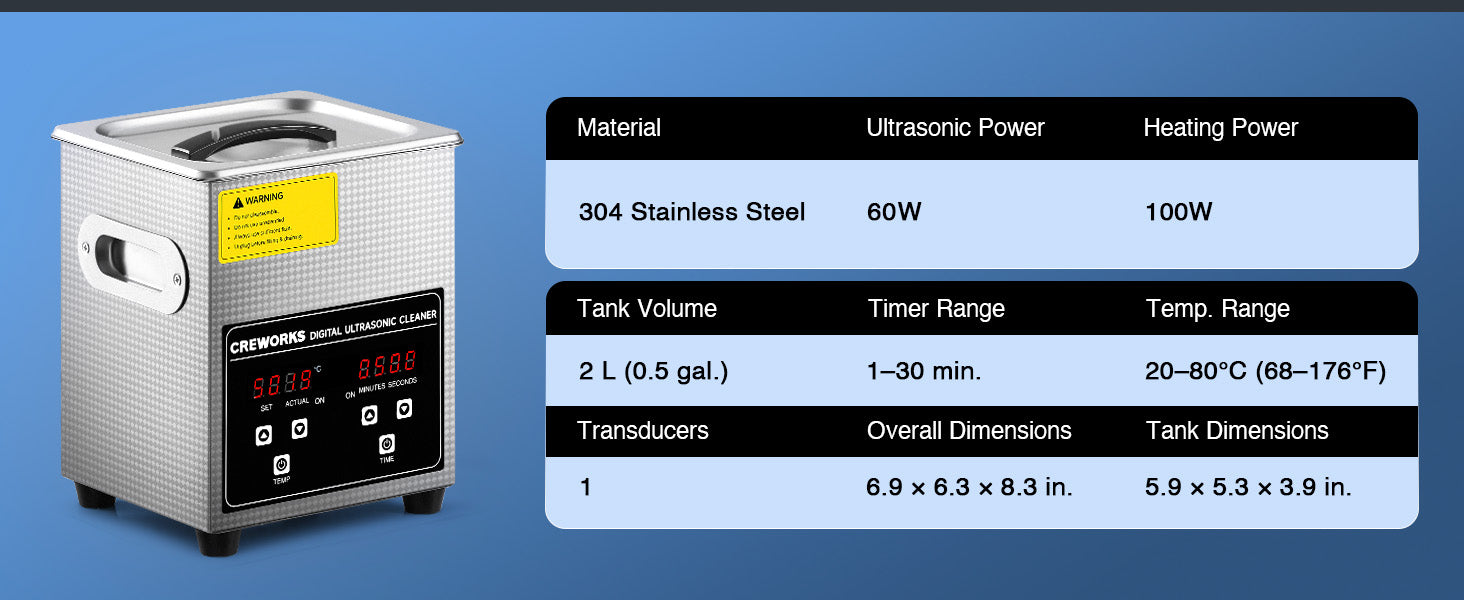 Our 60W ultrasonic cleaner is just the thing! Its 40kHz sound waves agitate the water in the 2 L (0.5 gal.) basin, creating cavitation that thoroughly cleans your items without the need for harsh chemicals or radiations. With the 100W heating power, our ultrasonic cleaning machine provides even greater strength. The intuitive control panel provides timed cleaning for up to 30 minutes and heated cleaning at temperatures between 20 and 80°C (68 and 176°F). Enjoy years of helpful use thanks to stainless steel construction inside and out, built-in protection against electrical surges, and 4 nonskid rubber feet to grip any countertop. Best of all, our ultrasonic parts cleaner is easily portablce thanks to the inset handles on either side.