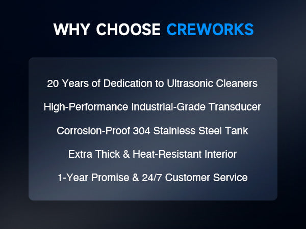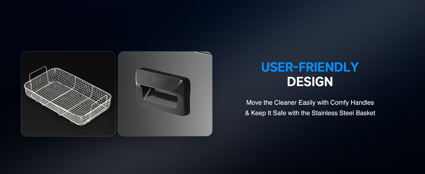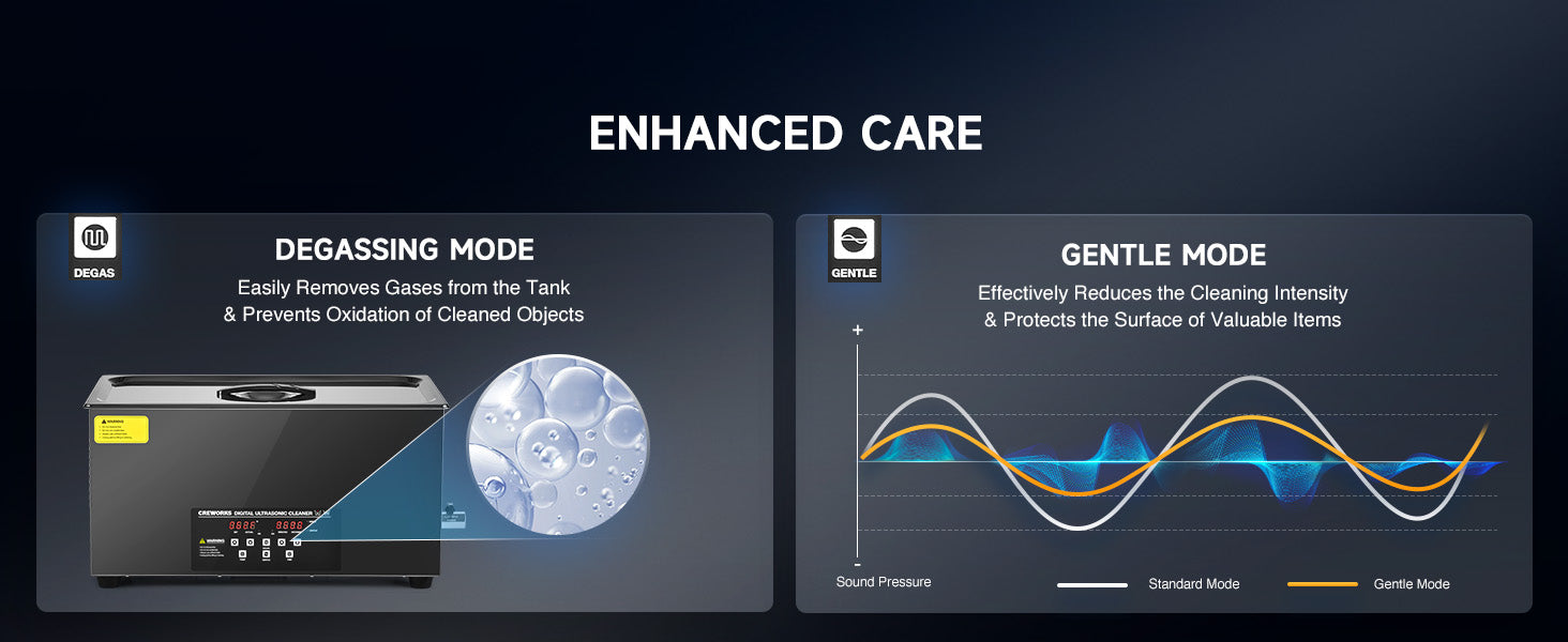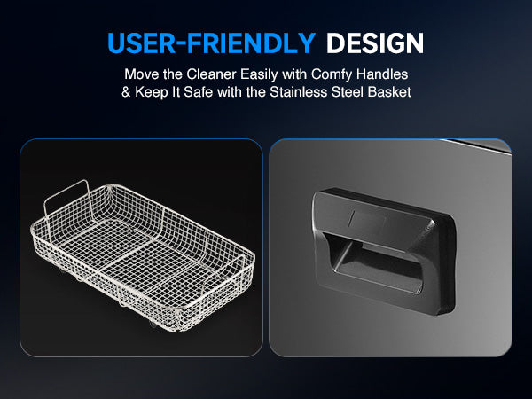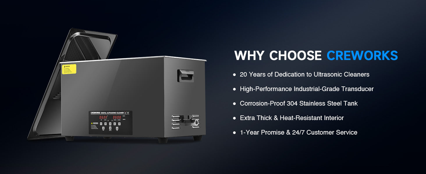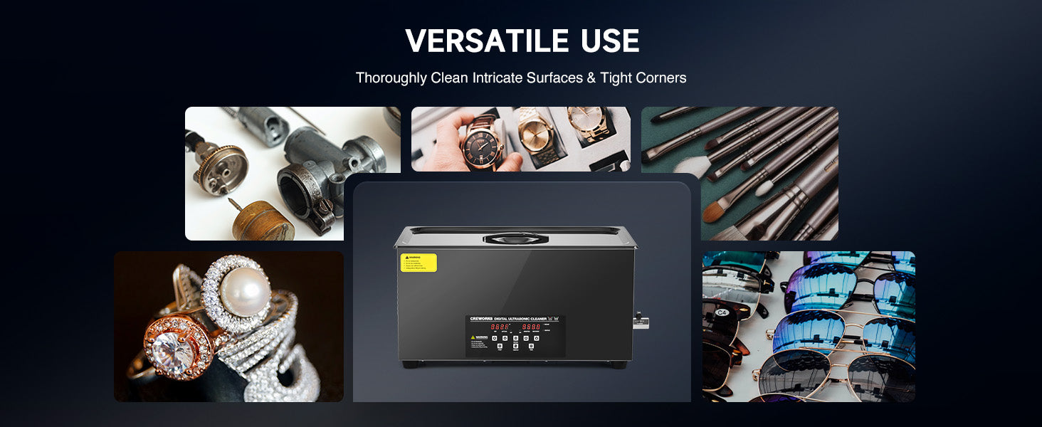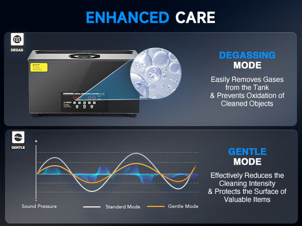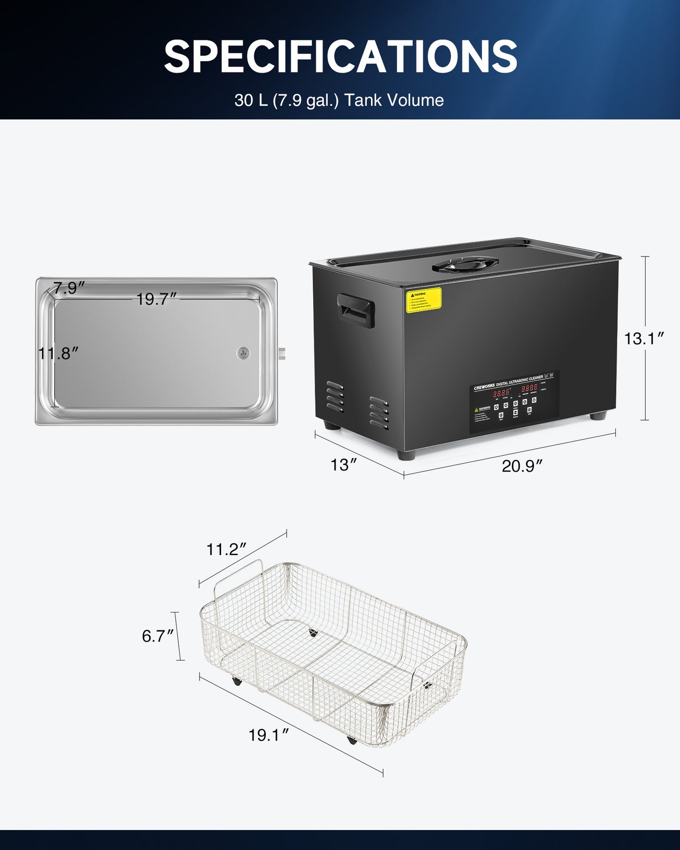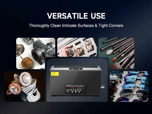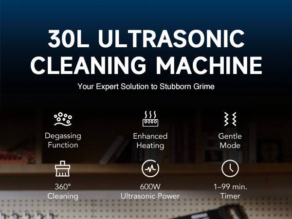 Our 600W ultrasonic cleaner is just the thing! Its 40kHz sound waves agitate the water in the 30 L (7.9 gal.) basin, creating cavitation that thoroughly cleans your items without the need for harsh chemicals or radiations. With the enhanced 1200W heating power, our ultrasonic cleaning machine provides even greater strength. The intuitive control panel allows for standard 1-30 minutes or extended 1-99 minutes timed cleaning, and heated cleaning at temperatures between 68 and 176°F (20 and 80°C). Featuring degas and gentle modes, our ultrasonic parts cleaner ensures your cleaned items are protected while effectively removing dirt and grime. The ultrasonic cavitation machine's unibody stainless steel basin, flexible printed circuit, and 4 non-skid rubber feet make for years of dependable performance.