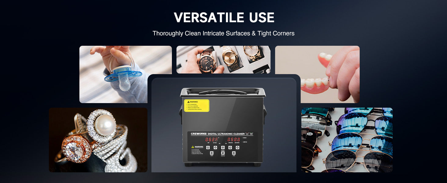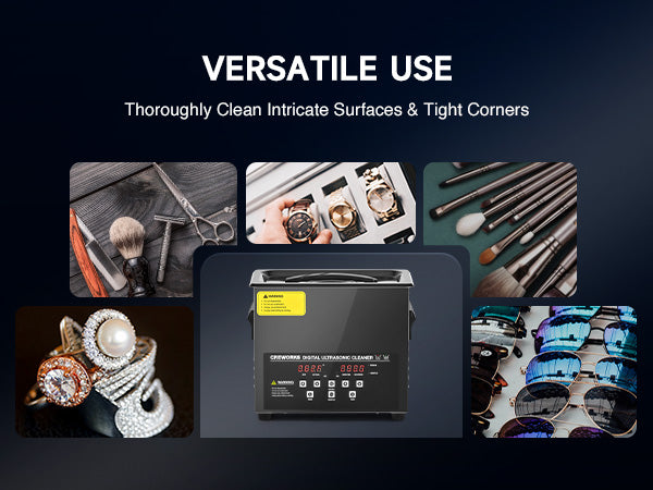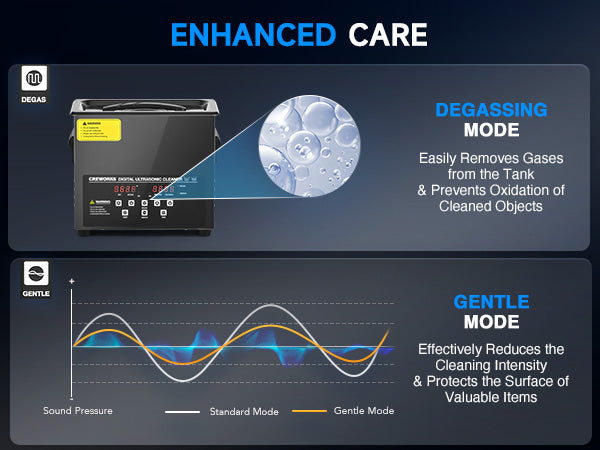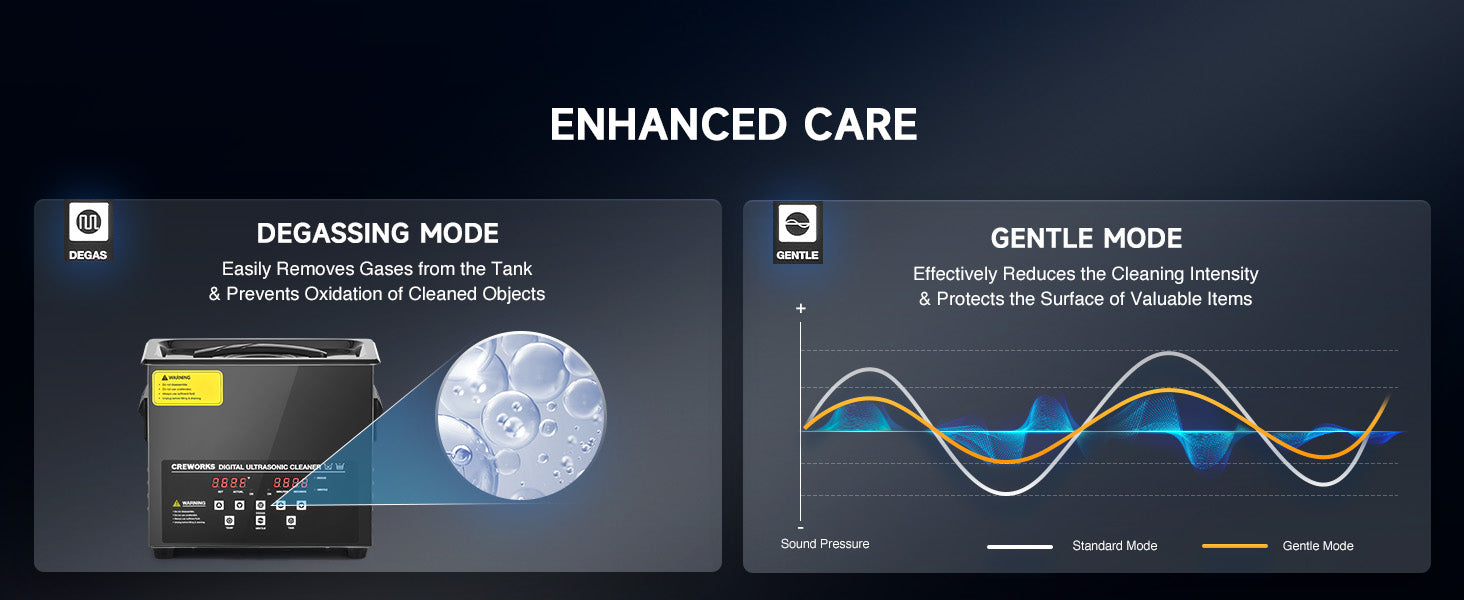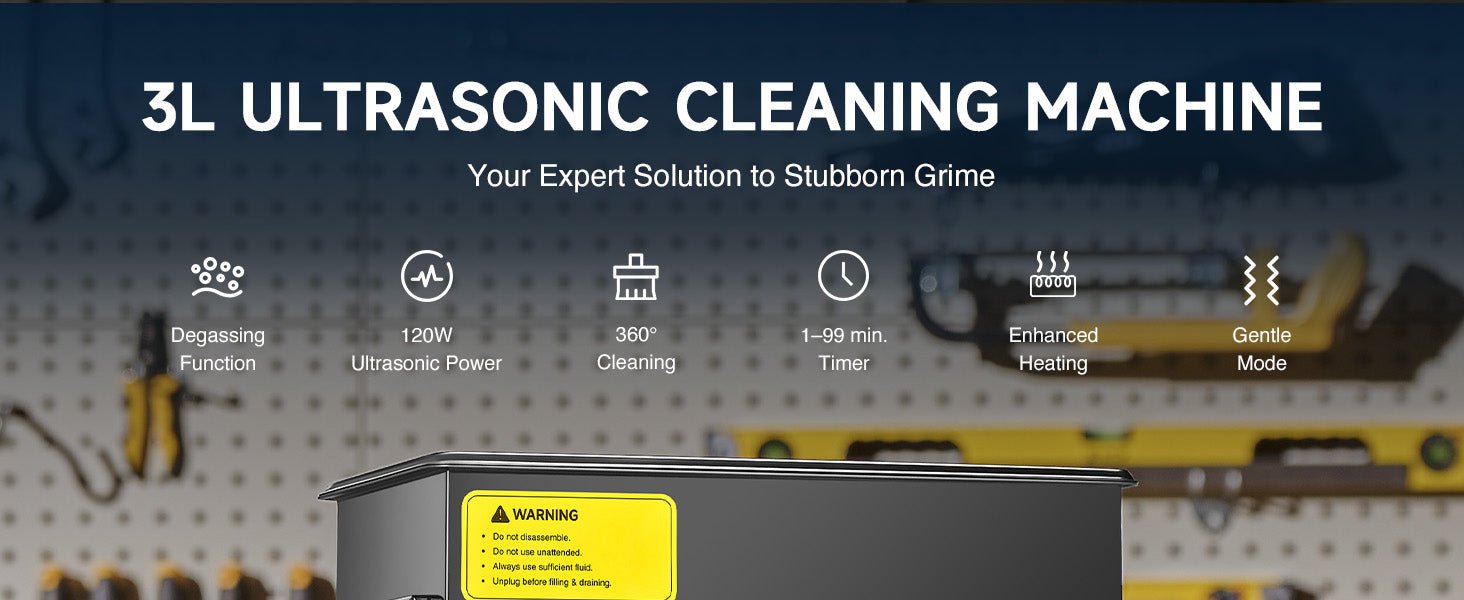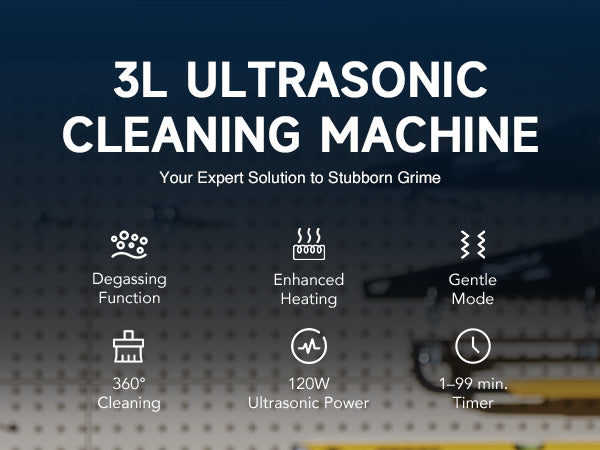 Our 120W ultrasonic cleaner is just the thing! Its 40kHz sound waves agitate the water in the 3 L (0.8 gal.) basin, creating cavitation that thoroughly cleans your items without the need for harsh chemicals or radiations. With the enhanced 300W heating power, our ultrasonic cleaning machine provides even greater strength. The intuitive control panel allows for standard 1-30 minutes or extended 1-99 minutes timed cleaning, and heated cleaning at temperatures between 68 and 176°F (20 and 80°C). Featuring degas and gentle modes, our ultrasonic parts cleaner ensures your cleaned items are protected while effectively removing dirt and grime. The ultrasonic cavitation machine's unibody stainless steel basin, flexible printed circuit, and 4 non-skid rubber feet make for years of dependable performance.