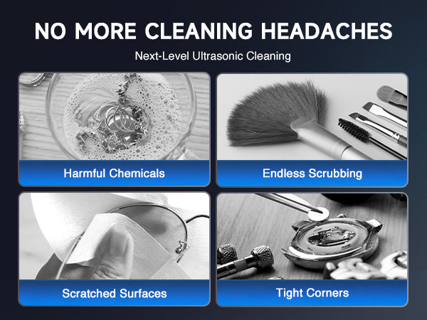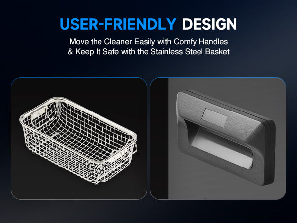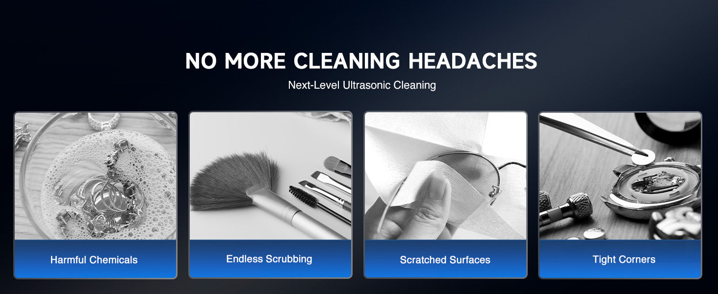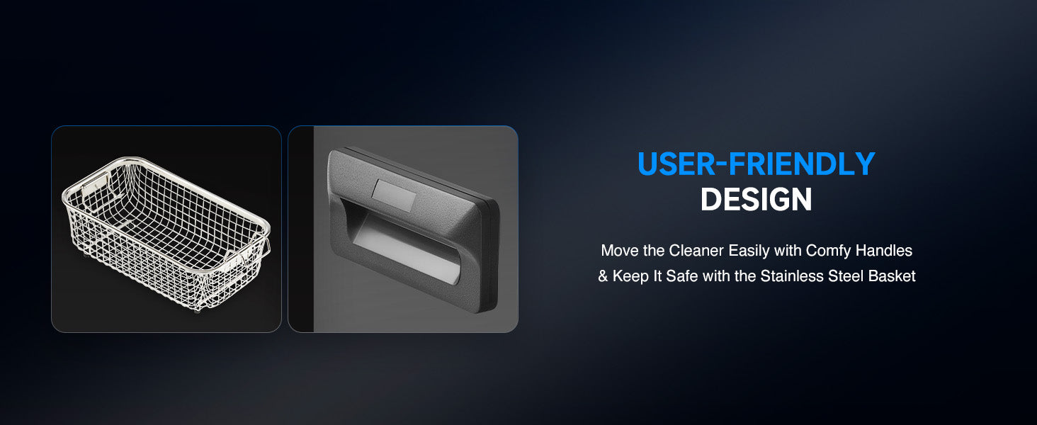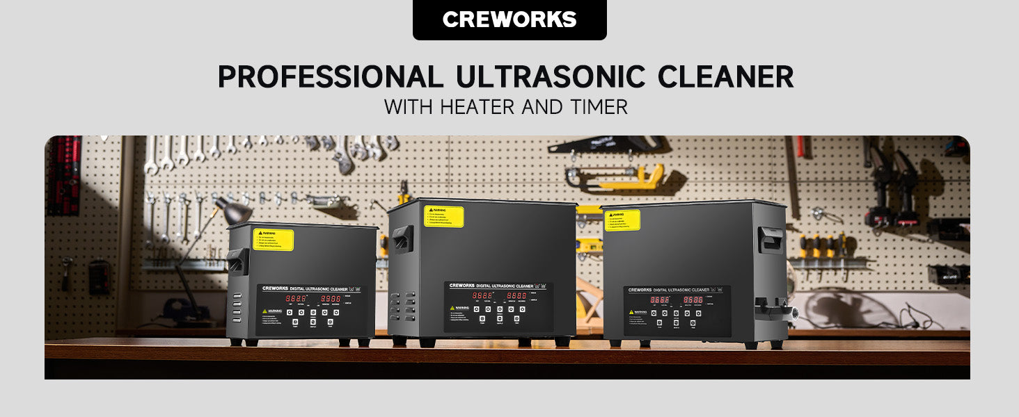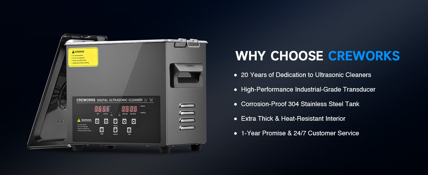 Our 120W ultrasonic cleaner is just the thing! Its 40kHz sound waves agitate the water in the 3 L (0.8 gal.) basin, creating cavitation that thoroughly cleans your items without the need for harsh chemicals or radiations. With the enhanced 300W heating power, our ultrasonic cleaning machine provides even greater strength. The intuitive control panel allows for standard 1-30 minutes or extended 1-99 minutes timed cleaning, and heated cleaning at temperatures between 68 and 176°F (20 and 80°C). Featuring degas and gentle modes, our ultrasonic parts cleaner ensures your cleaned items are protected while effectively removing dirt and grime. The ultrasonic cavitation machine's unibody stainless steel basin, flexible printed circuit, and 4 non-skid rubber feet make for years of dependable performance.