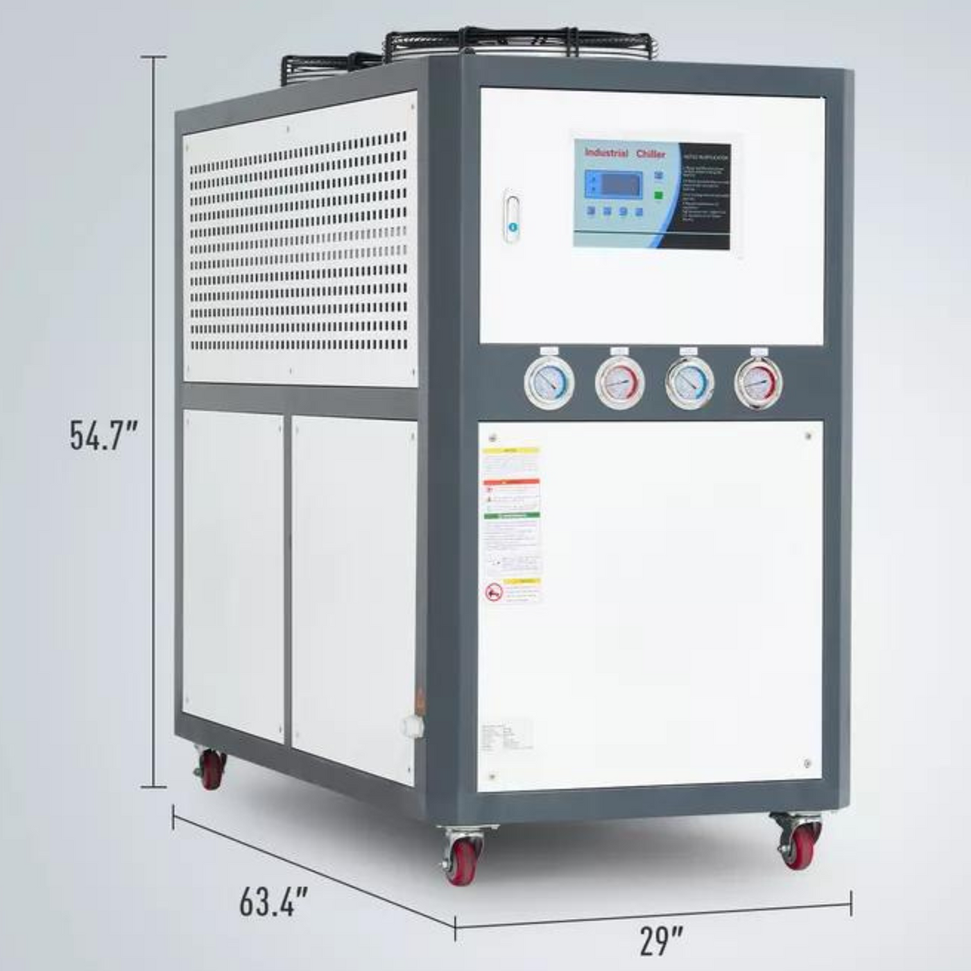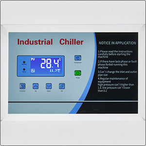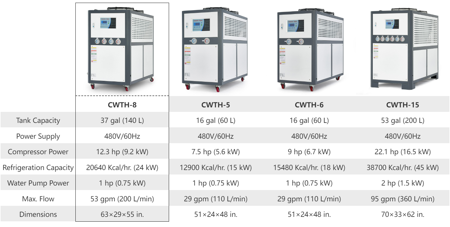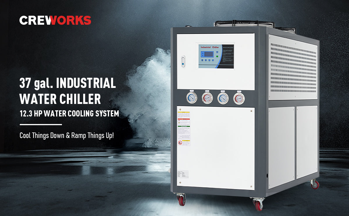 CREWORKS' CWTH-8 water chiller is your best choice! The spacious 37 gallon (140 L) water tank runs at 53 gpm (200 liters per minute) to remove heat from your machinery as it works. Its 12.3 hp compressor uses R407C refrigerant to keep your water-cooling system within 3℃ of a constant temperature. Cooling up to 81891 BTUs per hour, this chiller offers instantaneous cooling during industrial processes as well as significant savings in water usage through efficient water circulation. An observation window gauges the machine's water level and lets you know when it's time for a refill. The water inlet and outlet ports are brass for corrosion-free performance and well designed to prevent any leaks. The sensors provide real-time temperature information with a clear digital display, and indicator lights and alarms let you quickly know of any irregularities. Designed for plug-and-play operation, its convenient 4 wire connector provides quick and easy setup with your industrial power supply.